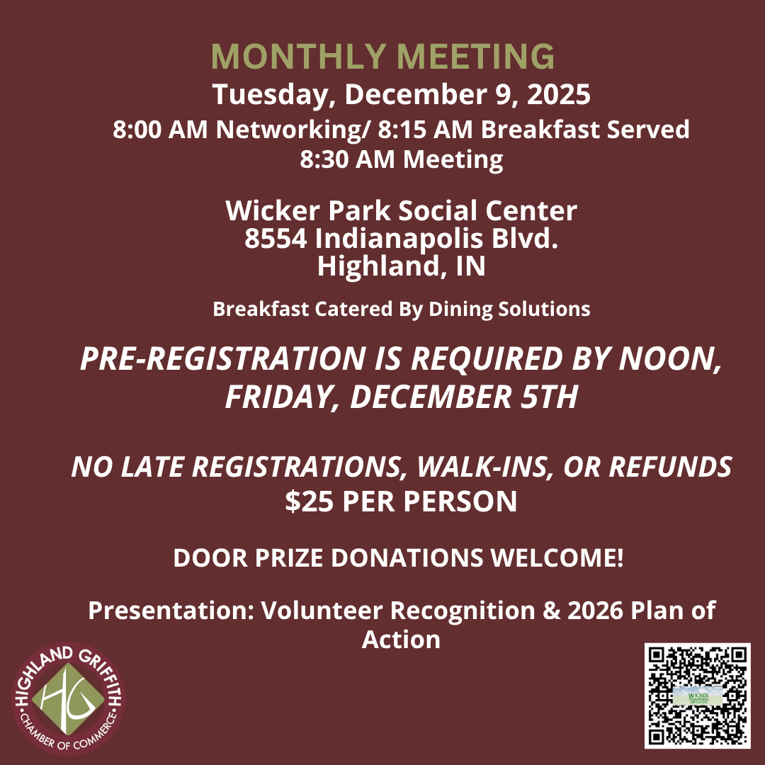 Join us for our December Membership Meeting at the Wicker Park Social Center. This is a breakfast meeting, which will be catered by Dining Solutions. We will be acknowledging our 2025 volunteers and outgoing officers, as well as preview our 2026 Plan of Action. RSVP in advance. Networking begins at 8:00 am/ Food served beginning at 8:15 am/ Meeting, reports and presentations begin at 8:30 am. PURSUANT TO A NEW MEAL POLICY ADOPTED BEGINNING IN 2025: ADVANCE REGISTRATION IS REQUIRED BY NOON, DECEMBER 5TH. NO LATE REGISTRATIONS OR WALK-INS WILL BE PERMITTED. NO REFUNDS WILL BE MADE IF YOU DO NOT ATTEND. IF YOU CHOOSE TO BE INVOICED, AN INVOICE WILL BE SENT TO YOU UPON REGISTERING FOR THE EVENT AND WILL BE OWED IF YOU DO NOT ATTEND. At the meeting, there will be a 50/50 drawing, a drawing for a free meal registration to be used at next month's meeting. Door Prizes are welcome. Thank you to our President's Gold Sponsors: